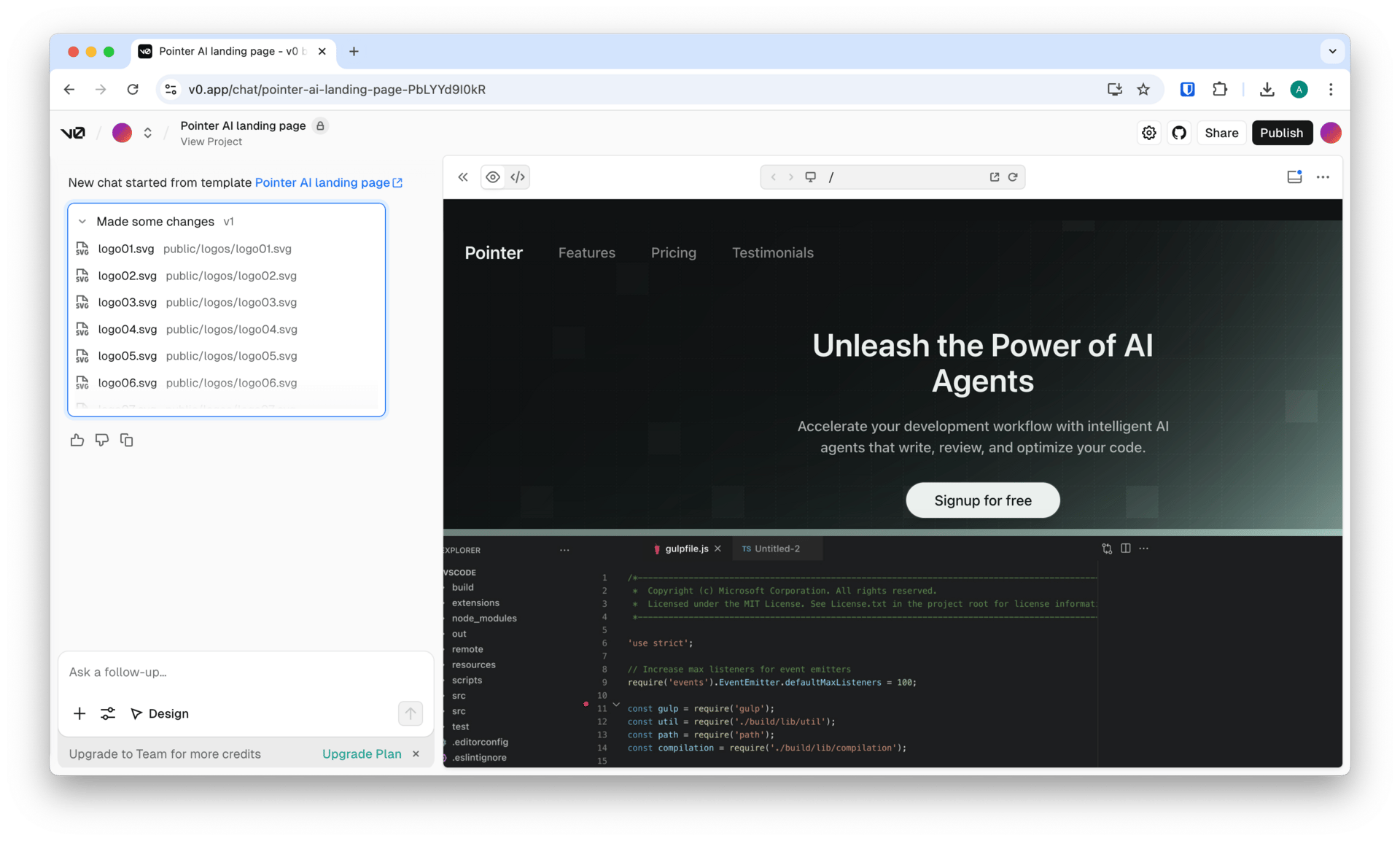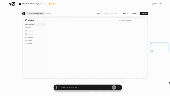Describe your app in text or upload screenshots/Figma files. Iterate visually with Design Mode, adjusting typography, spacing, or colors without spending credits. Connect real services like databases, APIs, or AI providers. Deploy with a single click to Vercel — add your own domain if you like.