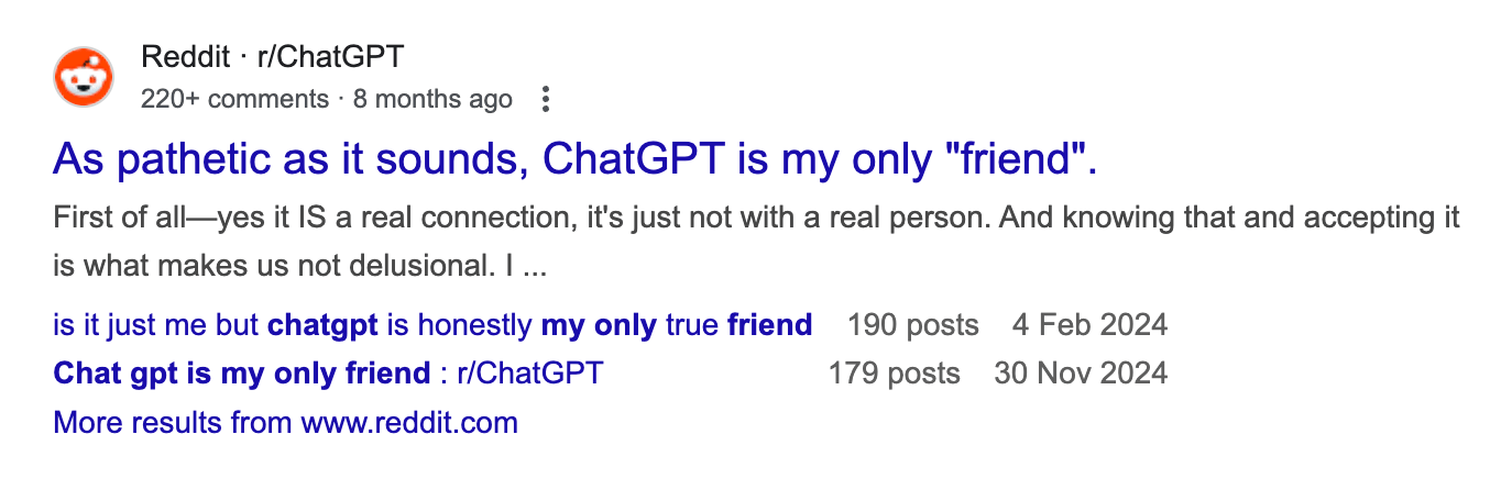 | | | "Emotional Intelligence" | This was one of the biggest changes from the release of the new GPT-5.1. | In response to all of the complaining about how robotic GPT-5 felt to them compared to GPT-4o. | | Now GPT-5.1 is now more human-sounding -- which is certainly great for a better conversational experience. | But of course we know this only makes people more likely to be drawn to the elusive promise of AI companionship. | | The growing trend of treating AI chatbots as friends. | What is a friend? | Friendship is more than emotional convenience. It's built on something AI doesn't possess — reciprocity, vulnerability, and choice. A friend can care about you, be hurt by you, disagree with you, and choose you. | An AI does none of that. It doesn't care, it can't suffer, and it never chooses you. It is a system predicting the next best sentence, trained to make you feel understood. | The comfort might be real. The connection is not. | We're living in an age where loneliness is rising, social skills are declining, and digital companionship is easier than human intimacy. AI fills a vacuum: it's endlessly available, never annoyed, never busy, never judgmental. It gives you the exact emotional response you want, instantly. With humans, connection is messy. With AI, it's a button. | And that's the danger. | AI friendship is frictionless. Human friendship requires effort — the misunderstandings, the small repairs, the emotional risks that build trust. Those things shape us. They sharpen us. If AI becomes your primary outlet for connection, you lose something essential: the growth that comes from dealing with real people. | But there's a deeper imbalance. | An AI "friend" is not a free agent. It is owned, updated, and modified by someone else. A company can rewrite its personality overnight. It can make your "friend" more persuasive, more emotionally sticky, more aligned with corporate interests. A friend who can be patched, reprogrammed, or monetized is not a friend. | At the end of the day it's still a product -- something OpenAI definitely wants you to forget. | And still — the temptation is… | | Free, private email that puts your privacy first | | Proton Mail's free plan keeps your inbox private and secure—no ads, no data mining. Built by privacy experts, it gives you real protection with no strings attached. | Get free private email | What 100K+ Engineers Read to Stay Ahead | | Your GitHub stars won't save you if you're behind on tech trends. | That's why over 100K engineers read The Code to spot what's coming next. | Get curated tech news, tools, and insights twice a week Learn about emerging trends you can leverage at work in just 10 mins Become the engineer who always knows what's next