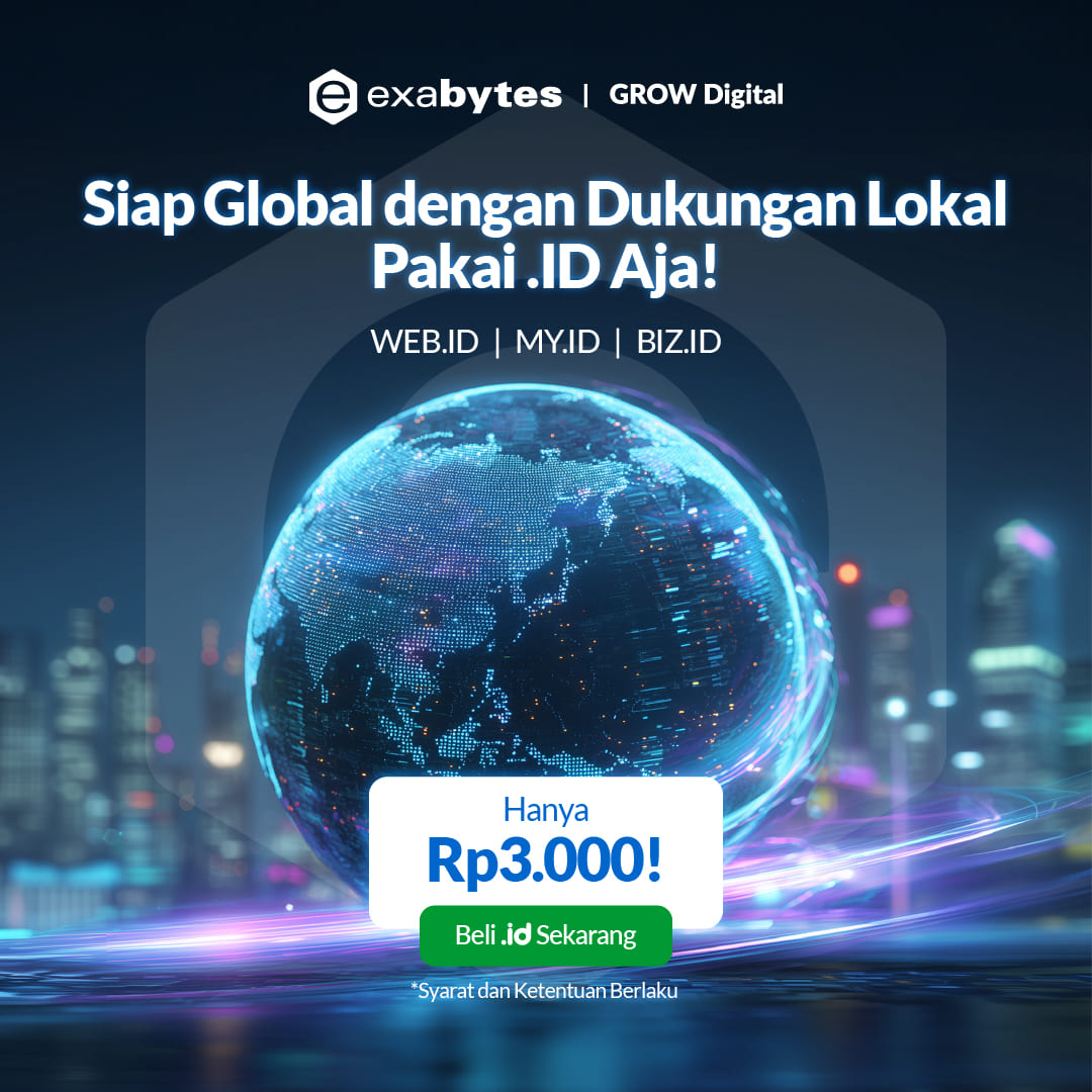 | Bisnis lokal apa hanya bisa pakai .ID aja? Jangan salah dulu! Ekstensi .ID itu banyak pilihannya—dan masing-masing bisa disesuaikan dengan tujuan bisnismu. Mau kelihatan profesional, personal, atau fokus jualan? Semua ada. Pilih ekstensi .ID sesuai kebutuhan kamu 👀 🏪 WEB.ID Cocok buat website perusahaan, landing page, atau toko online yang kelihatan profesional. 🤩 MY.ID Pas banget buat personal brand, freelancer, kreator, atau portofolio online kamu. 💼 BIZ.ID Pilihan tepat untuk UMKM & startup yang fokus jualan dan siap berkembang. Dapatkan WEB.ID, MY.ID, atau BIZ.ID hanya Rp3.000 aja! 😎 Tunggu apalagi? Jelajahi pilihannya dan beli .ID yang sesuai untuk kamu sekarang. | | | Privasi Anda penting bagi kami. Harap tinjau Kebijakan Privasi Exabytes dengan mengklik di sini. Untuk informasi mengenai Exabytes, kunjungi exabytes.co.id/hubungi-kami. Hak Cipta © PT Exabytes Network Indonesia. Cyber 2 Tower, Lantai 29, Jalan H.R. Rasuna Said, 12950, Jakarta Selatan, DKI Jakarta, Indonesia. Atur Preferensi | Buka di Browser | | | |