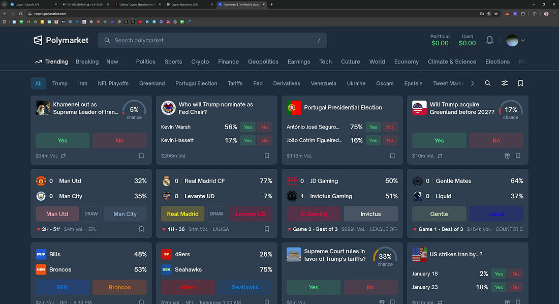 Crypto adoption is still largely driven by speculation. Most waves so far have come from perceived opportunity rather than everyday utility: ICOs, DeFi, NFTs, memecoins. Developers, traders, and investors all tend to migrate towards wherever upside appears. Let’s explore where we might see the next opportunity… 1. The Rise Of The Non-Technical FounderAI has fundamentally changed how software is built. Most developers now spend far less time writing code and more time describing intent, constraints, and outcomes. This creates an opportunity for non-technical founders who understand users, markets, or regulation but not low level engineering. This time last year I wouldn’t have trusted any of the LLM’s to write a smart contract. Now I wouldn’t trust a human written contract without at least running it by a model before deploying. I expect to see more stories of individuals vibe coding million, if not billion dollar products. 2. Prediction MarketsPrediction markets are growing quickly, with Polymarket emerging as a clear leader. Traders see these markets as more transparent and less manipulated. Sports betting provides a huge opportunity for growth and it’s a world cup year in 2026. There are opportunities emerging in this sector such as tracking wallets that could possibly have insider information on certain outcomes. If traction continues and the amounts at stake grow it could become the default betting playground. The secondary effect is that we get this source of truth from the markets where participants are financially incentivised to find true value through probabilities. 3. Tokenized StocksTokenized stocks may be the largest opportunity. A more permissive regulatory environment makes on-chain equities viable, and the capital allocated to markets dwarfs crypto. There are large pools of funds in digital assets which are waiting for programmable, always on, global stock markets. I expect this will see explosive TVL growth in 2026 and beyond. 4. Privacy an zkEverythingMost smart contract protocols are working towards enabling some form of privacy infrastructure. This technology is built on top of zero-knowledge cryptography and it’s opening up new possibilities for developers. Towards the end of last year I participated in the Aztec token sale (developers behind the Noir DSP) and it was one of the better roll outs I’ve seen in recent years. In traditional finance we expect our financial transactions and balances to remain private and enabling this on-chain is going to create a better user experience. 5. StablecoinsStablecoins are approaching a tipping point. As the Lindy effect kicks in, they will be seen less as “risky cryptocurrencies” and more as financial infrastructure. Borrowing and lending platforms offer attractive yields and institutions are warming to the sector. This has knock on effects for dollar markets across DeFi which could benefit from the growth in stablecoin TVL. Dex’s like Uniswap and Curve and borrowing/lending platforms like Aave and Blend come to mind. 6. GameFi & Web3Gaming and web3 social feel inevitable but slower. On-chain gaming like a decentralized p2p poker game seems so obvious I’m just surprised noone has done it yet. Decentralized social networks where users own their data make sense conceptually, but user experience and onboarding is not there yet. Possibly longer term plays rather than defining narratives for 2026 but I wouldn’t be surprised to see a breakout dApp. 7. DerivativesHyperliquid has seen great success with it’s semi-decentralized perpetual futures platform. Perp’s are the bread and butter of crypto and I expect this market to continue to grow with networks and platforms competing for attention and TVL. Products such as options contracts are well suited to digital assets. There are other sectors that remain under-developed such as forex and commodity trading. Decentralized finance creates room for disruption and I believe the opportunity to bring these on-chain is growing. Successful crypto narratives do not emerge because they are elegant or ethical. They emerge when incentives, timing and belief align. The next big thing in crypto might be just around the corner and the opportunity in 2026 is to identify any speculative trends early. Keep an eye on Bitcoin’s approach to $100k and ETH/BTC breaking out of it’s long-term channel over the next month. The four year cycle suggests we should be balls deep in a bear market but it doesn’t feel like that. Bitcoin continues to grind up and Ethereum is holding it’s own. Alts haven’t been resuscitated yet but optimism and is potentially just a few candles away. Positive sentiment is quietly and cautiously returning. Social links are below and if you enjoyed this newsletter I would appreciate it if you could share this content |