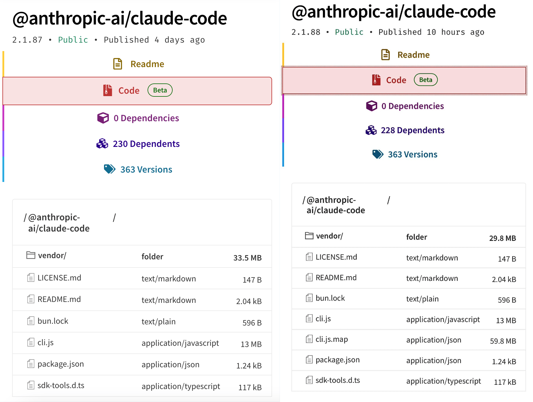 cli.js.map was leaked in version 2.1.88: (2.1.87 vs 2.1.88) |